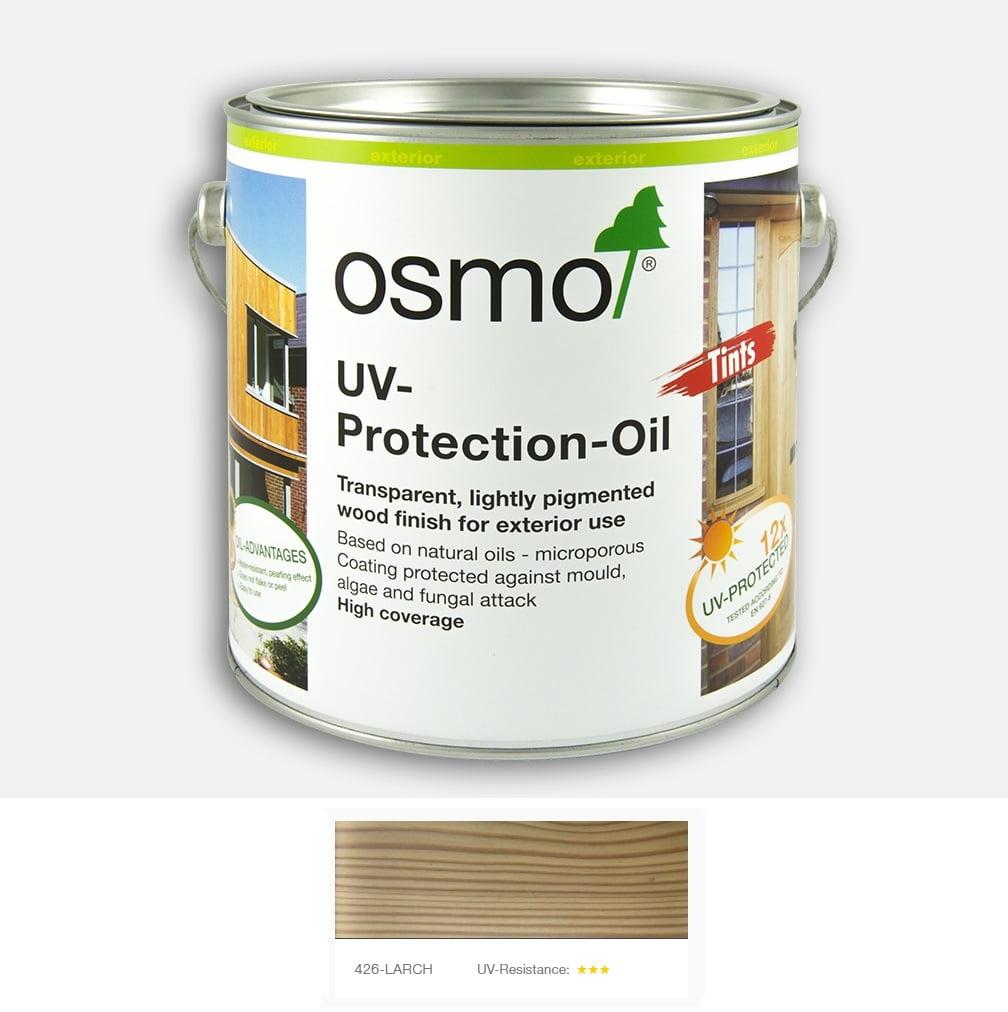 Osmo UV-Protection-Oil Tints is furnished with bio- cides and therefore it is only to be used in outdoor areas. The added active ingredients delay or minimize the risk of algae and fungal attack. For effective pro- tection, two coats are to be carried out. In accordance with the latest technical research, permanent pro- tection against algae and fungal attack cannot be provided. Osmo UV-Protection-Oil Tints Natural 429 protects wood nearly invisibly. The natural wood tone is pre- served - it does not enhance the the natural colour tone of the wood (no permanent wet effect).